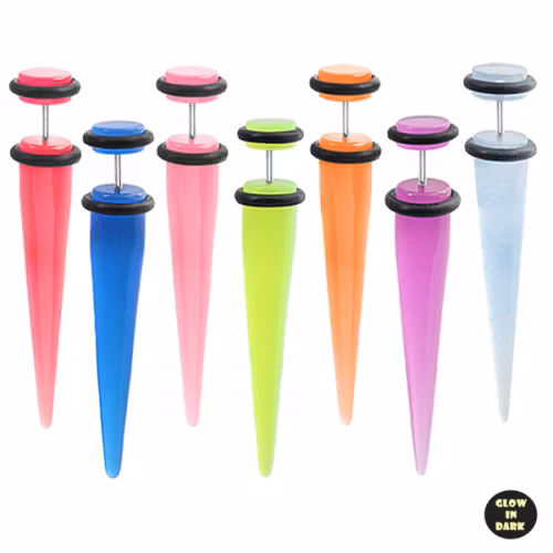 Fakepiercing till öra som syns i mörker. Laddas upp genom att hålla dom under en lampa en stund. Kan användas av vem som helst som har ett vanligt piercat hål i örat. Staven är 1,2*7mm. Akrylplast med kirurg stål stav. Töjstorlek 8mm.