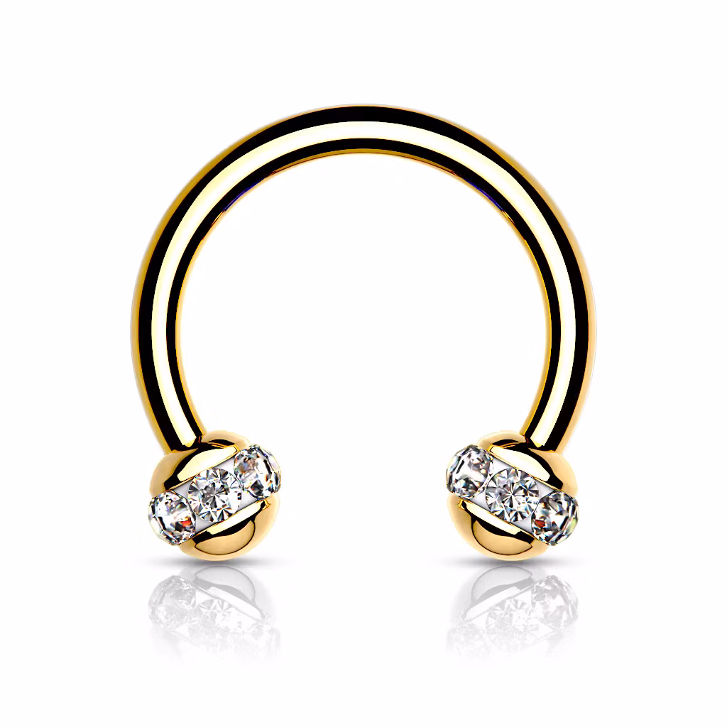 Guldpläterad hästsko med vita ädelstenar som sitter som ett band runt bollarna. Material: 316L Kirurg stål med en guldplätering över. Storlek: 1,2*8mm.