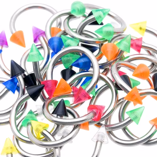 Hästsko barbell kan du använda istället för en cbr piercing ring. De är enklare att sätta i och plocka ur. Det är lätt att byta utseende på piercingen genom att byta till andra bollar/konor. Passar ex. öra, läpp, bröstvårta, näsa, ögonbryn, navel mm. 316L kirurg stål stav med akryl konor. Måtten nedan anger stavens tjocklek samt innerdiameter. Många färger som skickas slumpvis.