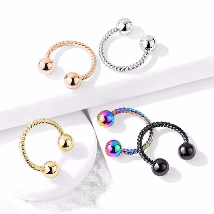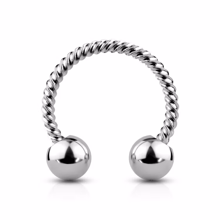 Snygg arbetad hästsko där staven ser snurrad ut. Material: kirurg stål. Finns i flera olika färger och två olika storlekar. Passar tillexempel bröst, läpp, ögonbryn, daith, helix, septum.