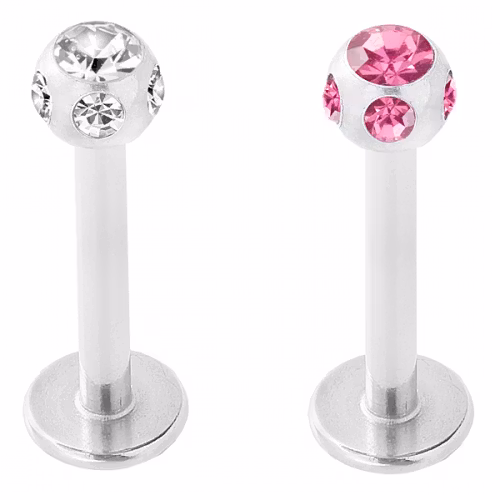 Labret passar till ex. läpp, monroe, kindpiercing, öra såsom ex. tragus, helix. Naturligtvis beroende på storlek och utformning av smycket samt tycke och smak. Det är lätt att byta utseende på piercingen genom att byta till annan boll/kona/topp. Se kategorin "lösa delar". 316L kirurg stål stav. Tjockleken på staven är 1,2mm och bollen är 4mm med 5st ädelstenar runt om. Välj färg samt längd på stav (måttet anger stavens längd utan bottenplattan och gängor).