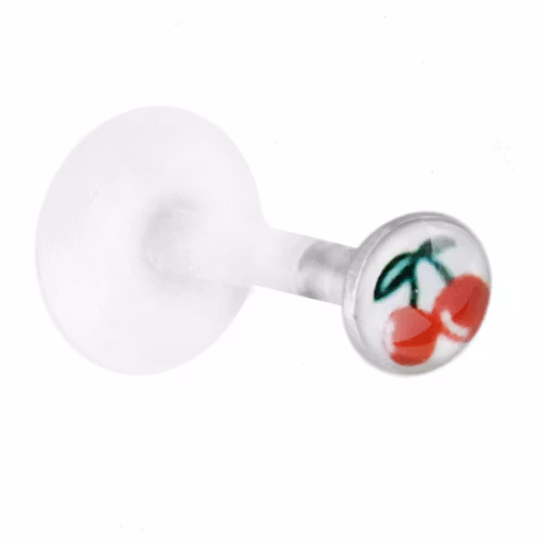 Bioflex labret med körsbär. Detta smycke är ett bra alternativ för nickelallergiker. Det är också ett bra "första smycke". Labret passar till ex. läpp, monroe, kindpiercing, öra såsom ex. tragus, helix. Naturligtvis beroende på storlek och tycke samt smak. Staven är 1,2*8mm (storleken anger stavens tjocklek samt längd utan bottenplattan).