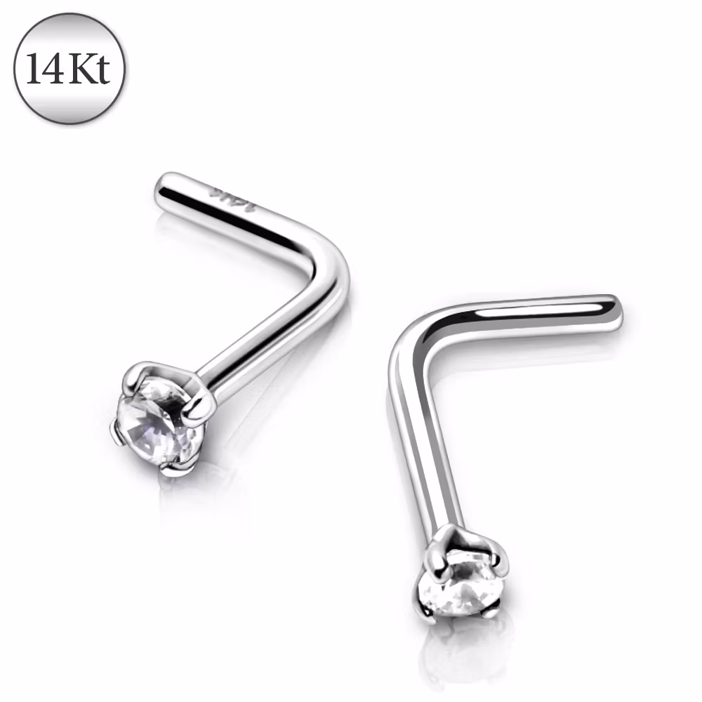 Väldigt fin näspiercing i 14 karats vitt guld. Stämpel finns på piercingen för äkthet. Ädelstenen är cubic zirconia. Finns i två olika tjocklekar.