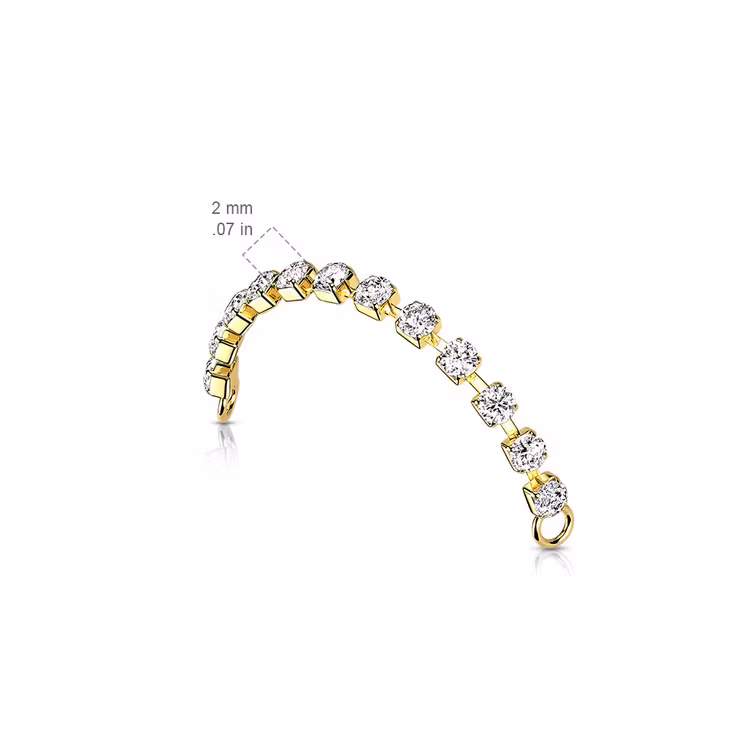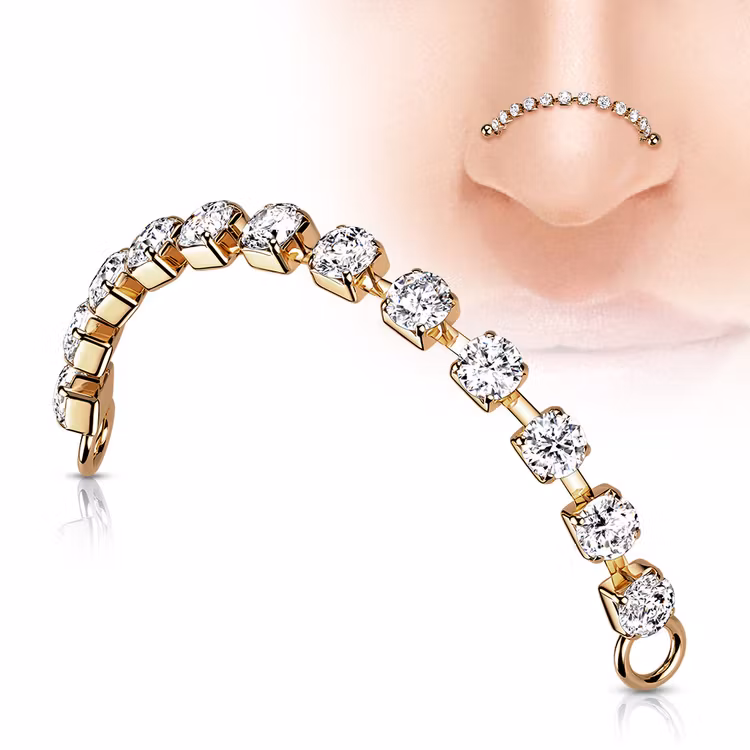 Sätt ihop en ädelstenskedja med dina näspiercingar! Kedjan är 2mm tjock och 2mm hög. Längden väljer du själv nedan. ädelstenarna är cubic zirconia. Material: 316L Kirurg stål.