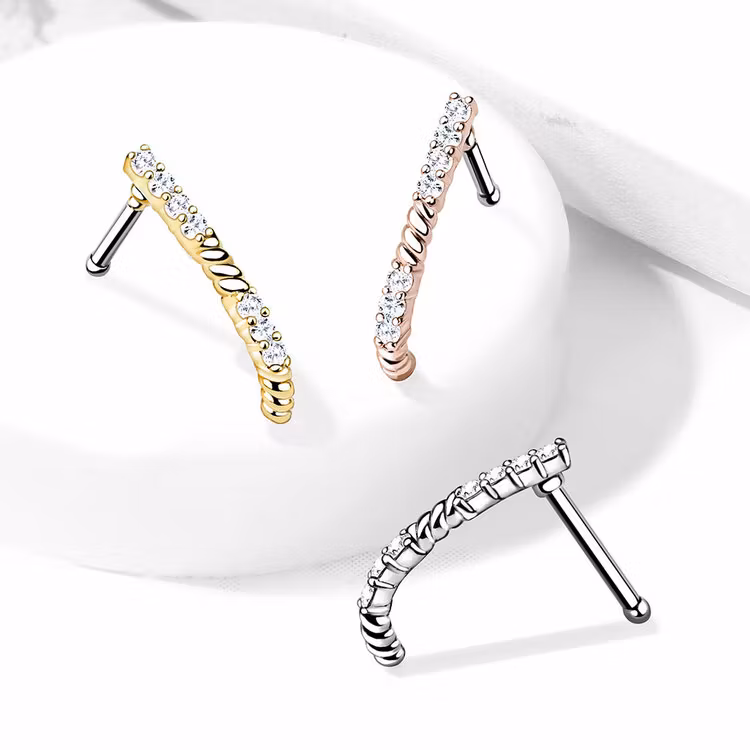 Fin näspiercing med vita små ädelstenar (cubic zirconia) staven är rak nässtav. Storleken är: 0,8*6mm Material: 316L Kirurg stål