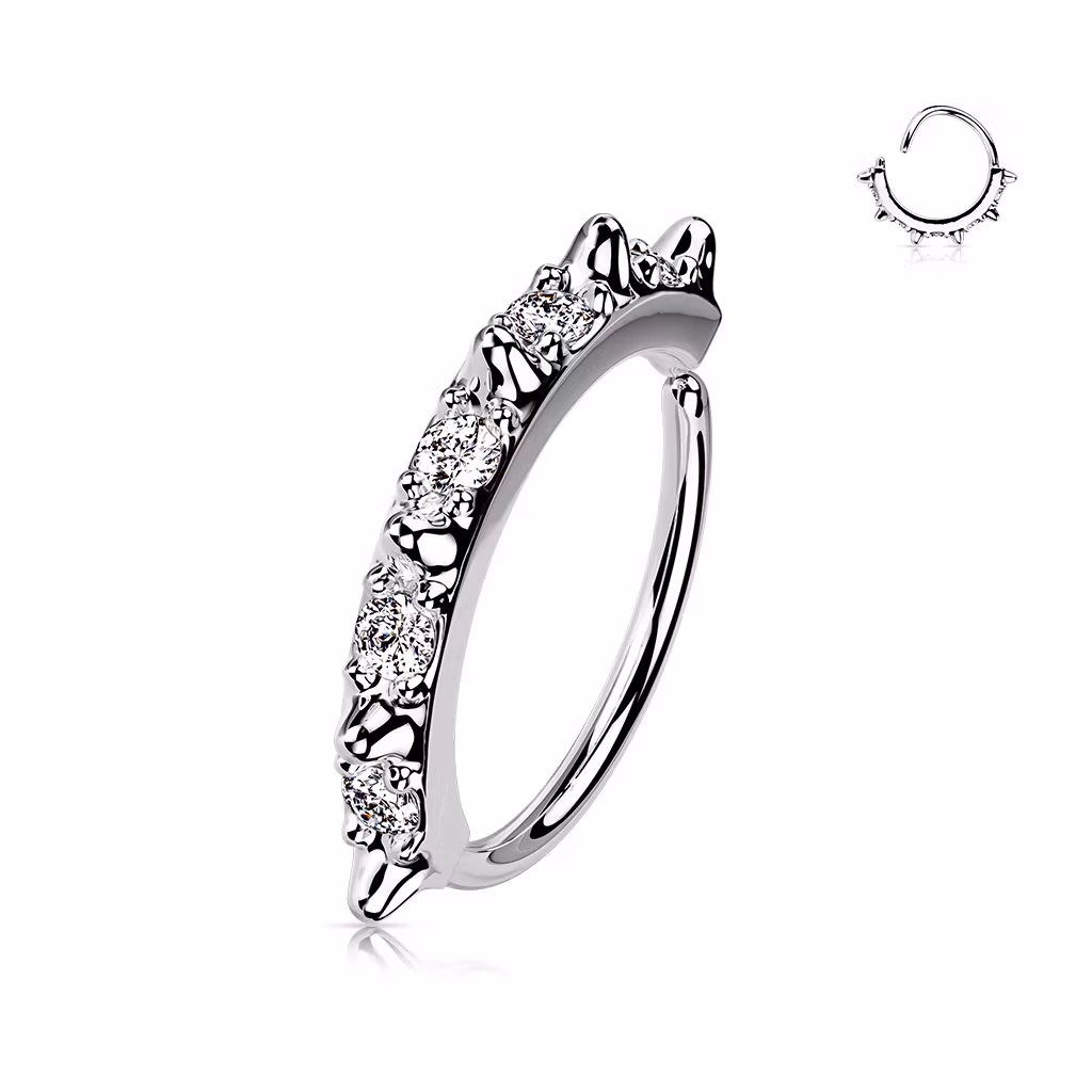 Snygg piercingring med spikes och vita ädelstenar. Material: 316L Kirurg stål. Storlek: 0,8*8mm. Passar exempelvis bra till näsa.