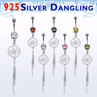 Väldigt fin hängande navelpiercing med drömfångare och ädelsten. Material är 925 silver. Storlek är 1,6*10mm. (Staven är 316L kirurg stål)