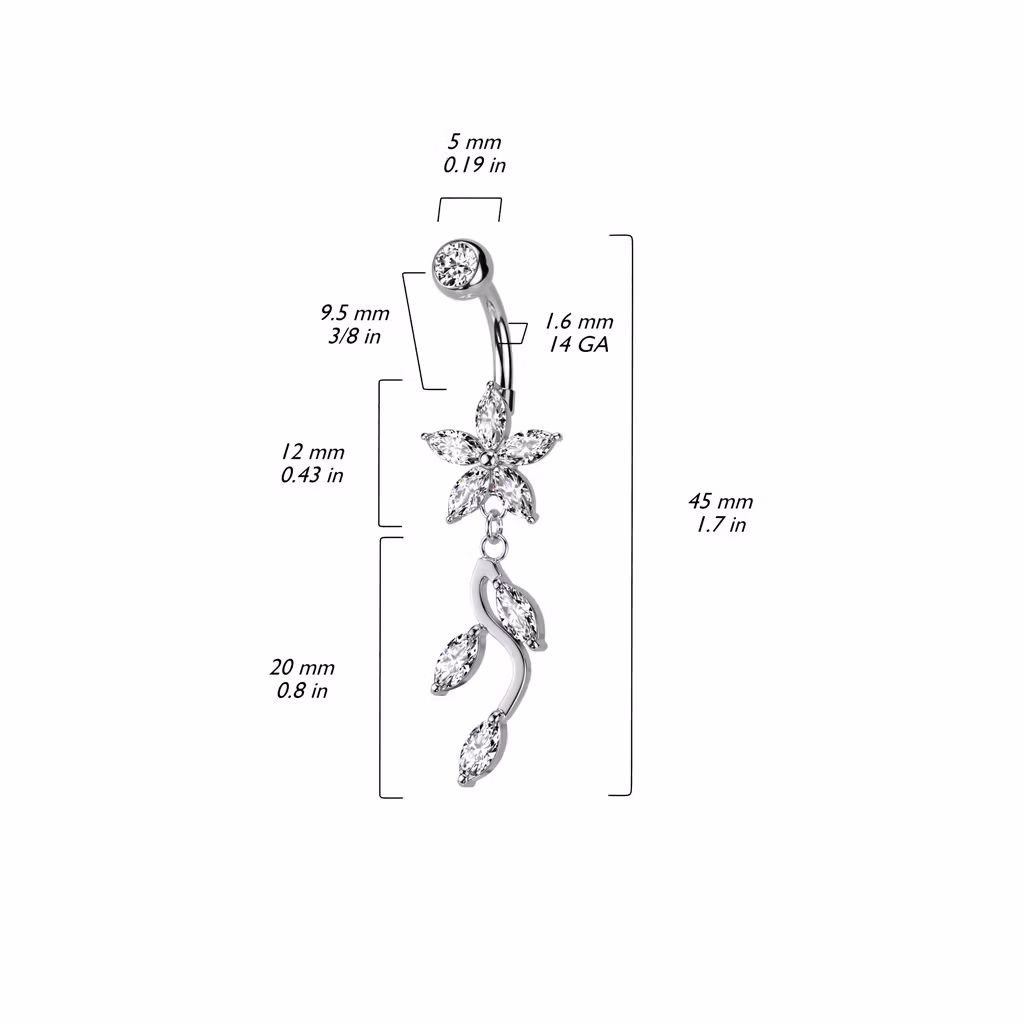 Vacker navelpiercing med hängande blomranka och blomma, vita cubic zirconia stenar. Material: 316L Kirurg stål. Storlek: 1,6*10mm