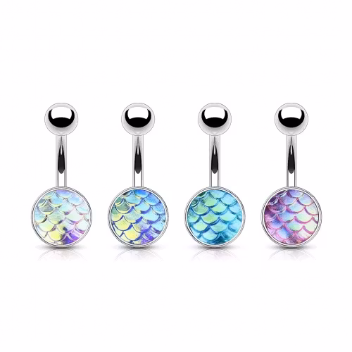 Vacker navelpiercing med fiskfjäll och skimmer. Material: 316L kirurg stål. Storlek: 1,6*10mm Bollens storlek: 5mm Finns i 4 olika färger.