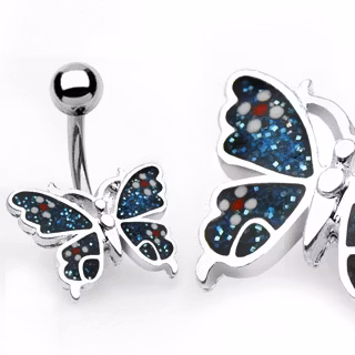Navelpiercing med fjäril som glittrar, väldigt fin! Material: 316L kirurg stål. Storlek: 1,6*10mm (OBS!) den är lite ljusare blå färg i verkligheten.