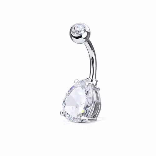 Piercing till navel med droppformat vit cz sten. Smycket är i 316L kirurgstål. 14k guld eller rhodium plätering. Kan köpas i två olika storlekar med 7mm eller 10mm droppformat sten.