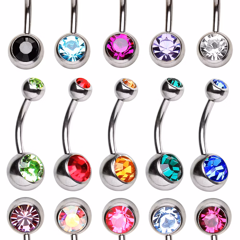 Piercing till navel med ädelstenar. 316L kirurg stål stav. Bollarna är 5mm och 8mm. Måtten nedan anger stavens tjocklek samt längd ("fågelvägen") utan bollar eller gängor.