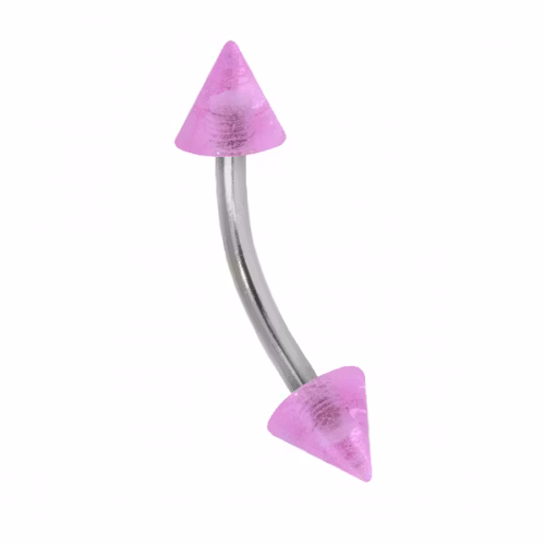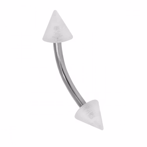 Piercingsmycke till ögonbryn med konor som syns i mörker. Laddas upp genom att hålla dom under en lampa en stund. 316L kirurg stål stav med akrylplast konor. Staven är 1,2*10mm. Konorna är 4*4mm.