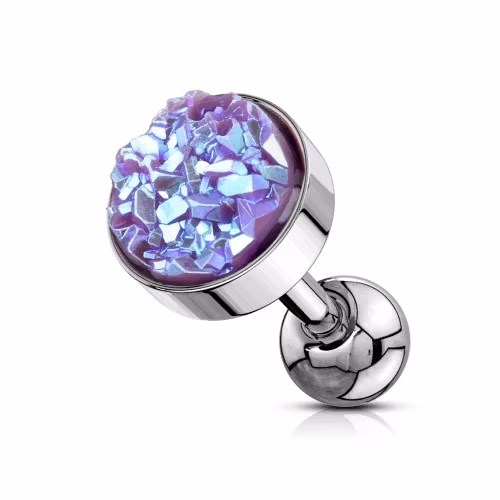 Tragus i stål med rund druzy sten. Glitter och skimmer.  Material: 316L kirurg stål. Storlek: 1,2*6mm Bollens storlek: 4mm  Finns i 6 olika färger.