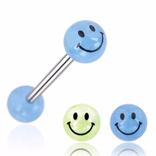 Piercingsmycke till tunga med bollar som syns i mörker. Staven är i 316L kirurg stål 1,6*15mm med 6mm bollar i akrylplast. Ögonen och munnen försvinner succesivt, men är inget som är farligt.