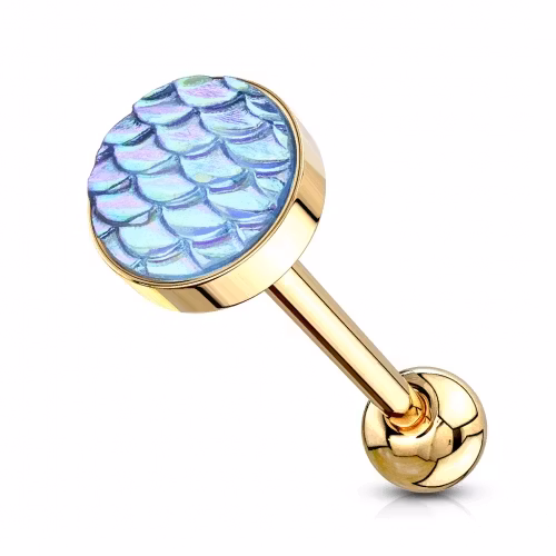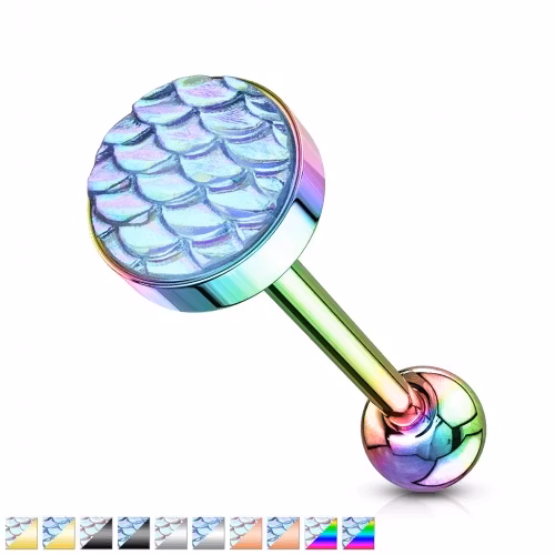 Tungpiercing barbell med fiskfjäll. Skimmer. Material: 316L kirurg stål. Storlek: 1,6*16mm Bollens storlek: 5mm Finns i 5 olika färger.