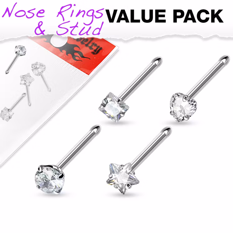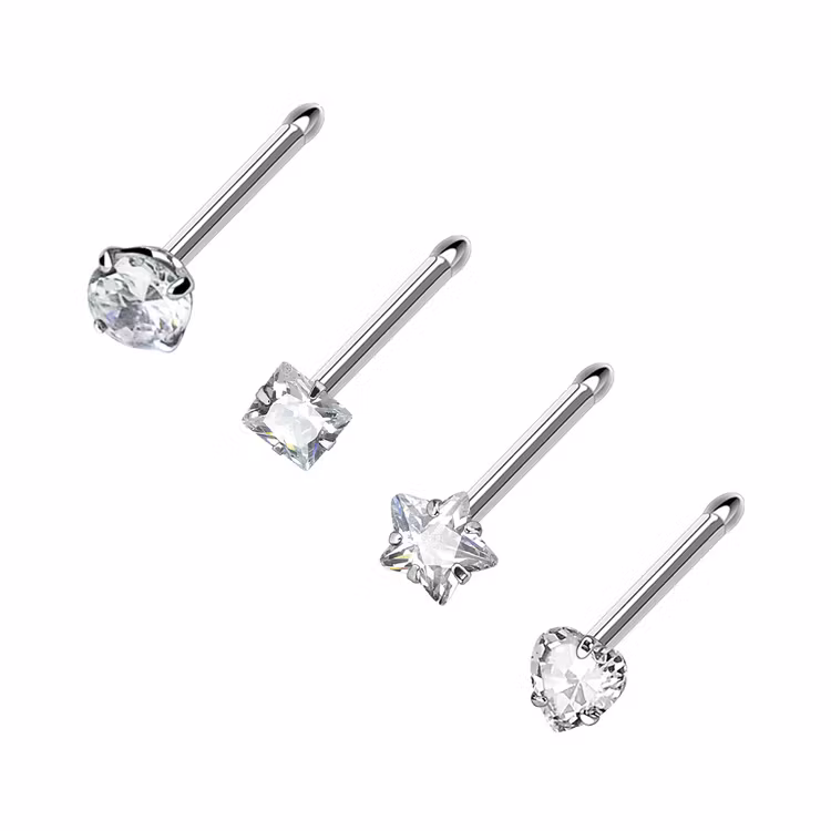 4 stycken raka nästavar med vita ädelstenar. Stenarna är cubic zirconia stenar och är slipade i: Stjärna, hjärta, cirkel och fyrkant. Material: 316L kirurg stål. Tjockleken på stavarna är: 0,8mm