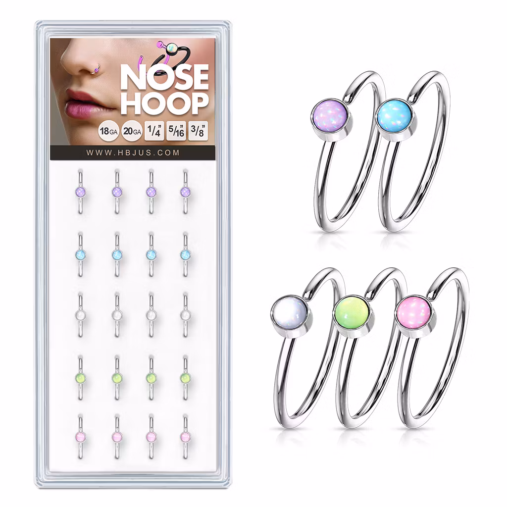 Display med 20 stycken näsringar i 316L Kirurg stål. Displayen innehåller 5 olika färger. Opalstenen är 2,5mm och ringen är 0,8*7mm.
