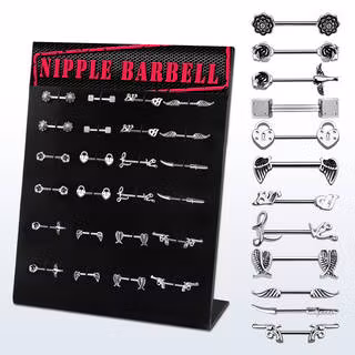 Snygg svart akrylplast display med 24 par bröstbarbeller. Många olika motiv, snygg att ha på kassadisken. Material: 316 Kirurg stål Storlek på barbellerna är 1,6*14mm.