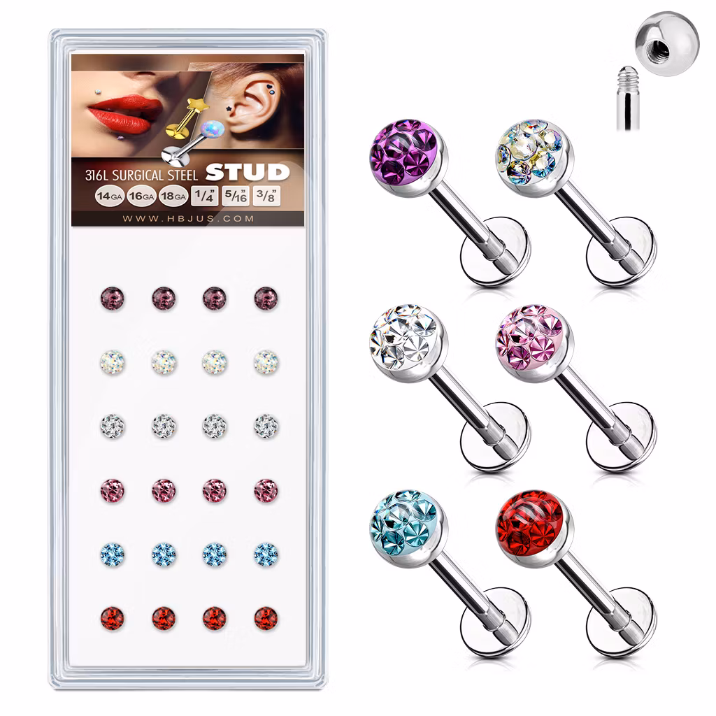 Display med 24 stycken labretter 964.96 NOK 24 stycken labretter i 316L kirurg stål. 6 olika färger. Storlek: 1,2*8mm. 4 stycken av varje färg. Bollen är 4mm. I lager. Lägg i korgen Lagersaldo: 3 Artikelnummer: 2182 Dela Information Recensioner 24 stycken labretter i 316L kirurg stål. 6 olika färger. Storlek: 1,2*8mm. 4 stycken av varje färg. Bollen är 4mm.