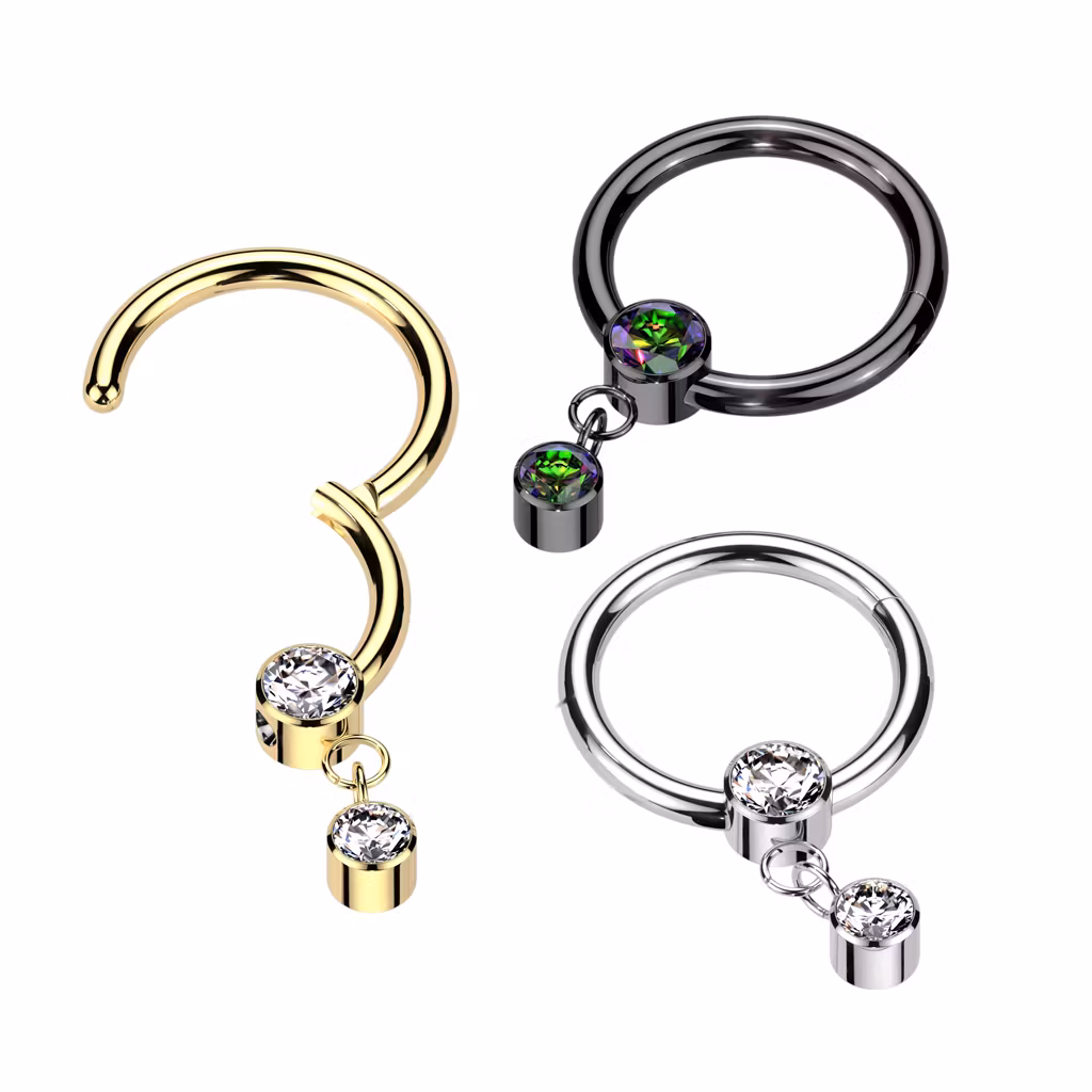 Segmentringar i G23 titan med gångjärn så att själva låset sitter fast. Två hängande ädelstenar vilket gör att den är fin i öron, septum, daith, bröstvårta och så vidare. Storlek: 1,2*8mm