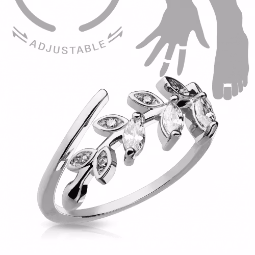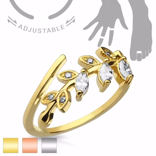 Elegant ring som du justerar till önskad storlek. Kan användas både till fingrar eller tår! Stenarna i löven är Cubic Zirconia.