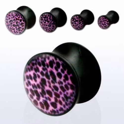 Lila leopardmönstrad plugg i svart akryl. Väldigt fin
