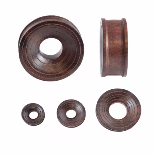 Handgjord tiki trä tunnel med utfrästa spår. Smycket har en kant runt på båda sidor. Organiskt material som gör att huden kan andas, vilket gör att det luktar m