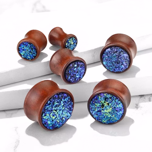 Väldigt fin organisk träplugg med druzy sten med blått skimmer.  Varför skall man välja ett organisk material undrar du? det tillåter huden att andas på ett helt annat sätt än andra material, det är skonsamt och väldigt allergivänligt.
