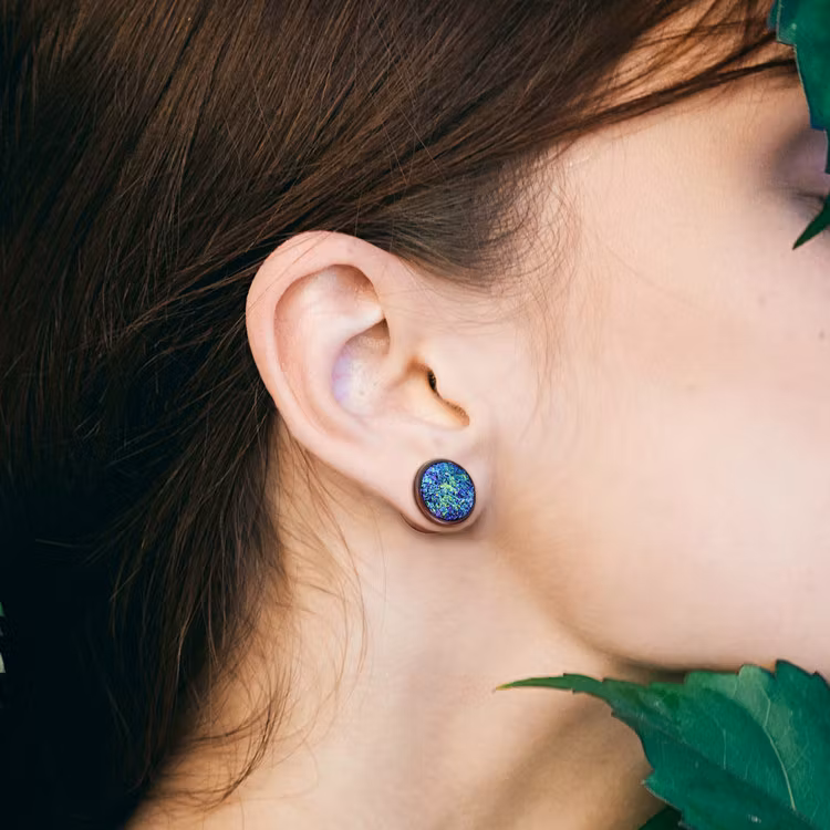 Väldigt fin organisk träplugg med druzy sten med blått skimmer.  Varför skall man välja ett organisk material undrar du? det tillåter huden att andas på et